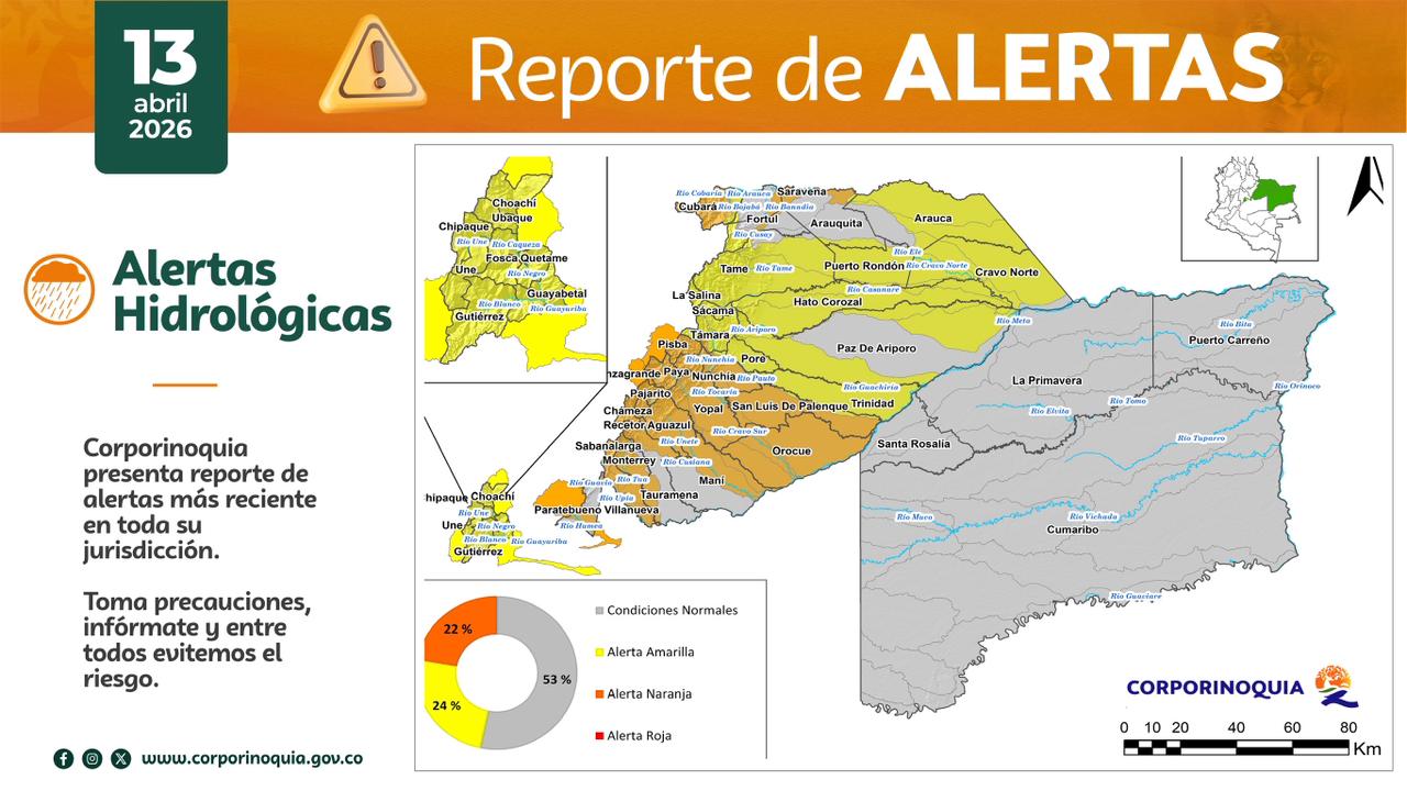 En relación con las alertas hidrológicas, el 22% del territorio se encuentra en nivel naranja en municipios de Cundinamarca como Paratebueno; en Casanare, Villanueva, Monterrey, Sabanalarga, Recetor, Maní, Aguazul, Chámeza, Yopal, Nunchía, San Luis de Palenque, Orocué y Tauramena; en Boyacá, Pajarito, Labranzagrande, Paya, Pisba y Cubará; y en Arauca, Fortul y Saravena.