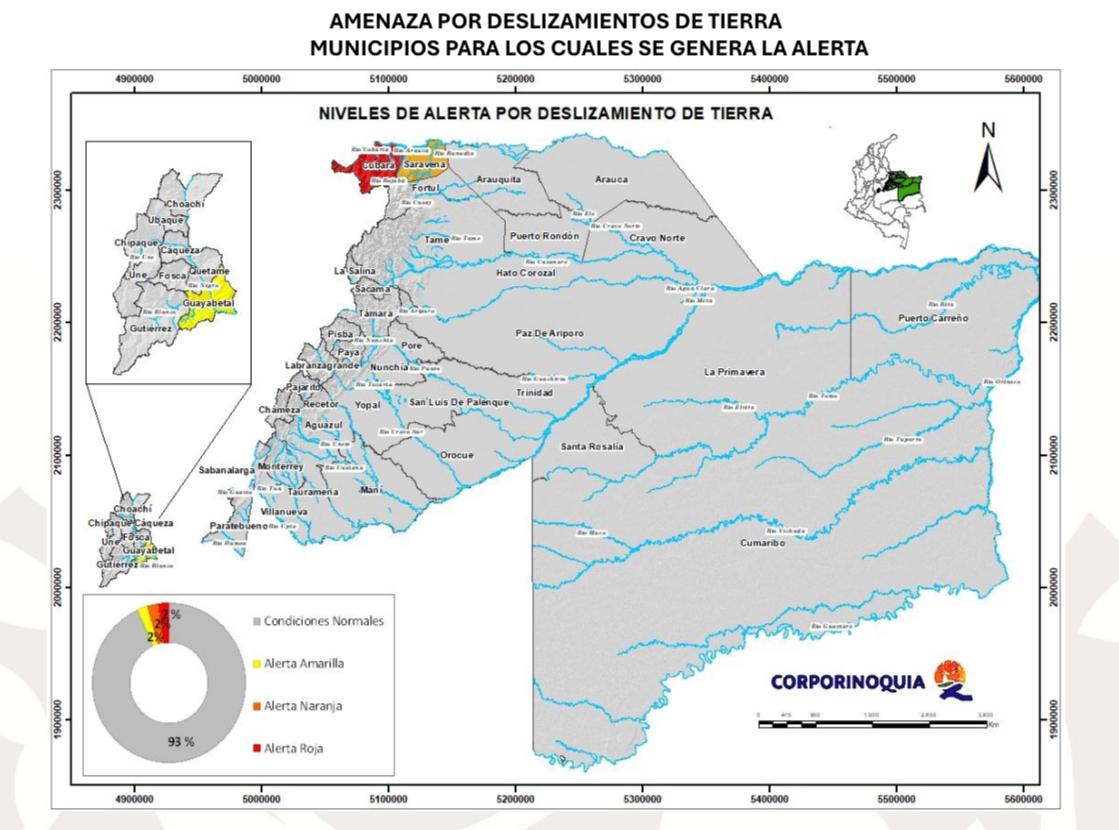 Se generan alertas por amenaza de deslizamientos en municipios como Cubará (Boyacá), Saravena (Arauca) y Guayabetal (Cundinamarca), donde las condiciones del terreno y las variaciones de precipitación pueden incrementar la susceptibilidad de movimientos en masa.
