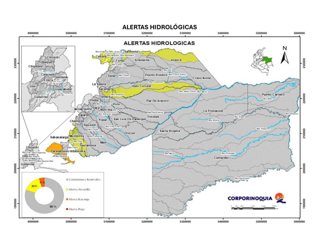 - La Corporación Autónoma Regional de la Orinoquía – Corporinoquia, a través del más reciente reporte del IDEAM, dio a conocer las condiciones hidrometeorológicas y alertas para los departamentos de Casanare, Arauca, Vichada, Boyacá y Cundinamarca, con el propósito de fortalecer la prevención y la gestión del riesgo en el territorio.